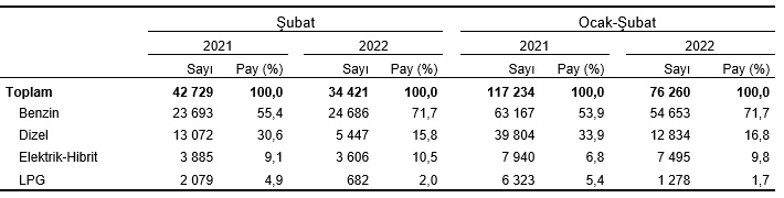 Ocak-Şubat döneminde trafiğe kaydı yapılan 76 bin 260 adet otomobilin %71,7'si benzin, %16,8'i dizel, %9,8'i elektrikli veya hibrit olup %1,7'si LPG yakıtlıdır. Şubat ayı sonu itibarıyla trafiğe kayıtlı 13 milyon 781 bin 610 adet otomobilin ise %37,5'i dizel, %35,8'i LPG, %25,7'si benzin yakıtlı olup, %0,7'si elektrikli veya hibrittir. Yakıt türü bilinmeyen(2) otomobillerin oranı ise %0,3'tür.