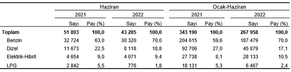 Ocak-Haziran döneminde trafiğe kaydı yapılan 267 bin 958 adet otomobilin %70,0'ı benzin, %17,1'i dizel, %10,5'i elektrikli veya hibrit olup %2,4'ü LPG yakıtlıdır. Haziran ayı sonu itibarıyla trafiğe kayıtlı 13 milyon 971 bin 955 adet otomobilin ise %37,3'ü dizel, %35,5'i LPG, %26,2'si benzin yakıtlı olup, %0,9'u elektrikli veya hibrittir. Yakıt türü bilinmeyen(2) otomobillerin oranı ise %0,3'tür.