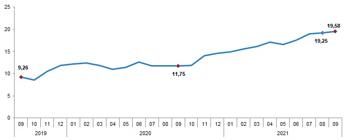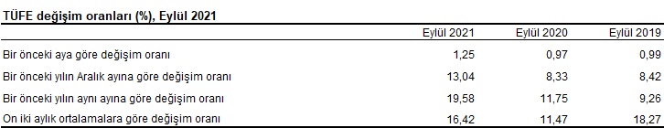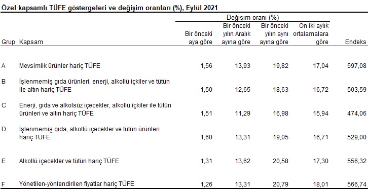 İşlenmemiş gıda ürünleri, enerji, alkollü içkiler ve tütün ile altın hariç TÜFE'de 2021 yılı Eylül ayında bir önceki aya göre %1,50, bir önceki yılın Aralık ayına göre %12,65, bir önceki yılın aynı ayına göre %18,63 ve on iki aylık ortalamalara göre %16,72 artış gerçekleşti.
