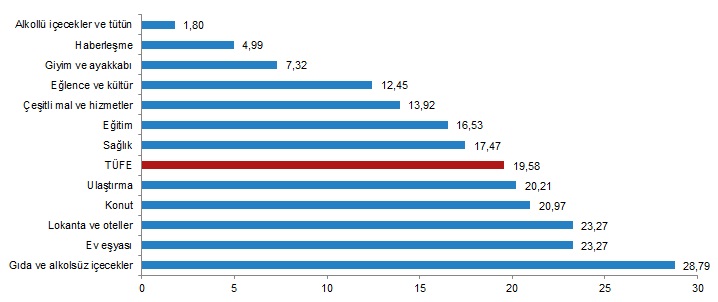 Yıllık en düşük artış %1,80 ile alkollü içecekler ve tütün grubunda gerçekleşti. Bir önceki yılın aynı ayına göre artışın düşük olduğu diğer ana gruplar sırasıyla, %4,99 ile haberleşme, %7,32 ile giyim ve ayakkabı ve %12,45 ile eğlence ve kültür oldu. Buna karşılık, bir önceki yılın aynı ayına göre artışın yüksek olduğu ana gruplar ise sırasıyla, %28,79 ile gıda ve alkolsüz içecekler, %23,27 ile ev eşyası ve %23,27 ile lokanta ve oteller oldu.