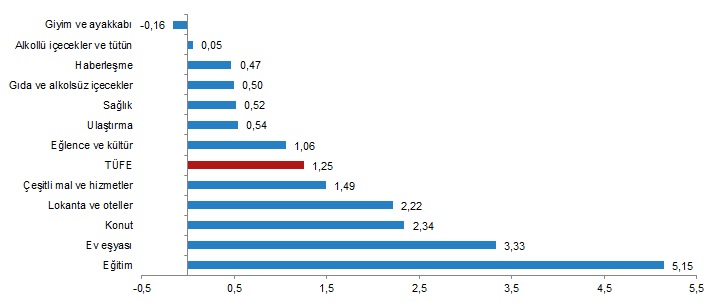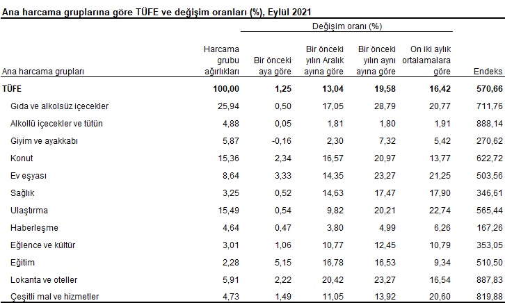 Aylık düşüş gösteren tek ana grup %0,16 ile giyim ve ayakkabı oldu. Ana harcama grupları itibarıyla 2021 yılı Eylül ayında en az artış gösteren ana gruplar %0,05 ile alkollü içecekler ve tütün, %0,47 ile haberleşme ve %0,50 ile gıda ve alkolsüz içecekler oldu. Buna karşılık, 2021 yılı Eylül ayında artışın yüksek olduğu gruplar ise sırasıyla, %5,15 ile eğitim, %3,33 ile ev eşyası ve %2,34 ile konut oldu.