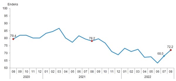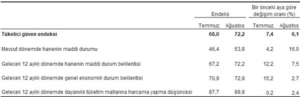 Türkiye İstatistik Kurumu ve Türkiye Cumhuriyet Merkez Bankası işbirliği ile yürütülen tüketici eğilim anketi sonuçlarından hesaplanan mevsim etkilerinden arındırılmış tüketici güven endeksi, Ağustos ayında bir önceki aya göre %6,1 oranında arttı; Temmuz ayında 68,0 olan endeks, Ağustos ayında 72,2 oldu.