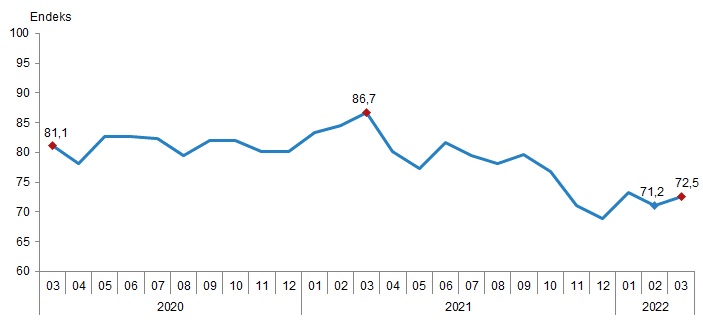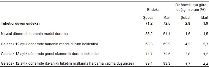 Türkiye İstatistik Kurumu ve Türkiye Cumhuriyet Merkez Bankası işbirliği ile yürütülen tüketici eğilim anketi sonuçlarından hesaplanan mevsim etkilerinden arındırılmış tüketici güven endeksi, Mart ayında bir önceki aya göre %1,9 oranında arttı; Şubat ayında 71,2 olan endeks, Mart ayında 72,5 oldu.