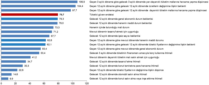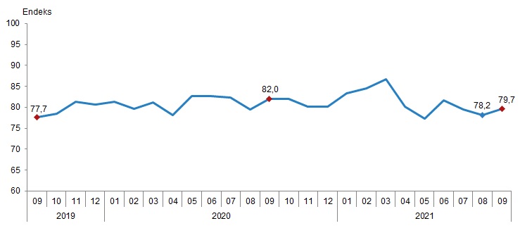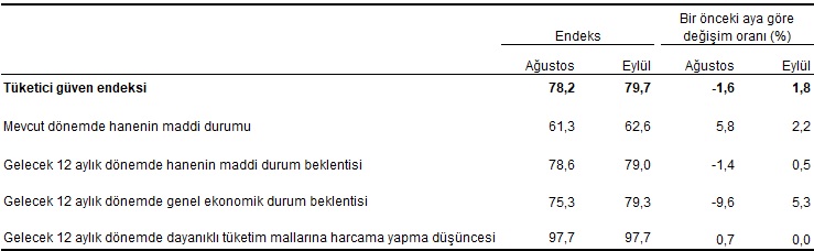 Türkiye İstatistik Kurumu ve Türkiye Cumhuriyet Merkez Bankası işbirliği ile yürütülen tüketici eğilim anketi sonuçlarından hesaplanan mevsim etkilerinden arındırılmış tüketici güven endeksi, Eylül ayında bir önceki aya göre %1,8 oranında arttı; Ağustos ayında 78,2 olan endeks, Eylül ayında 79,7 oldu.