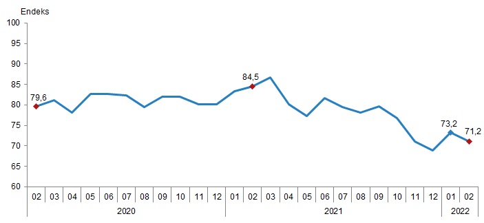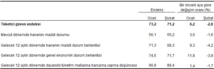 Türkiye İstatistik Kurumu ve Türkiye Cumhuriyet Merkez Bankası işbirliği ile yürütülen tüketici eğilim anketi sonuçlarından hesaplanan mevsim etkilerinden arındırılmış tüketici güven endeksi, Şubat ayında bir önceki aya göre %2,8 oranında azaldı; Ocak ayında 73,2 olan endeks, Şubat ayında 71,2 oldu.