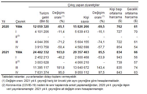 Ülkemizden çıkış yapan ziyaretçi sayısı 2021 yılı IV. çeyreğinde bir önceki yılın aynı çeyreğine göre %97,5 artarak 9 milyon 50 bin 112 kişi oldu. Bunların %83'ünü 7 milyon 511 bin 28 kişi ile yabancılar, %17'sini ise 1 milyon 539 bin 84 kişi ile yurt dışında ikamet eden vatandaşlar oluşturdu.