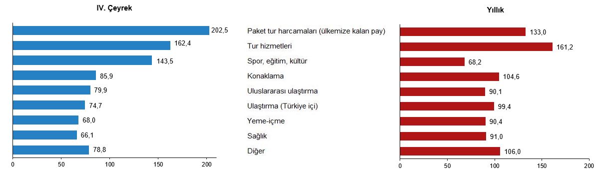 Bu çeyrekte tüm harcama türleri geçen yılın aynı çeyreğine göre arttı. Paket tur harcamaları (ülkemize kalan pay) %202,5, tur hizmetleri harcaması %162,4 ve spor, eğitim, kültür harcaması %143,5 arttı. Yıllık olarak değerlendirildiğinde ise en çok artış tur hizmetleri harcamalarında oldu.