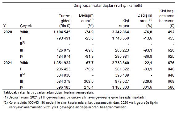 Bu çeyrekte yurt dışını ziyaret eden vatandaş sayısı bir önceki yılın aynı çeyreğine göre %301,6 artarak 1 milyon 188 bin 803 kişi oldu. Bunların kişi başı ortalama harcaması 586 dolar olarak gerçekleşti.