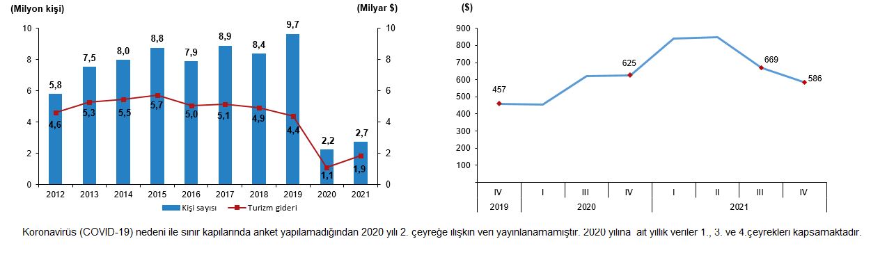 Yıllık olarak değerlendirildiğinde; turizm gideri, geçen yıla göre %67,7 artarak 1 milyar 851 milyon 922 bin dolar oldu. Bunun 1 milyar 819 milyon 811 bin dolarını kişisel, 32 milyon 111 bin dolarını ise paket tur harcamaları oluşturdu.
