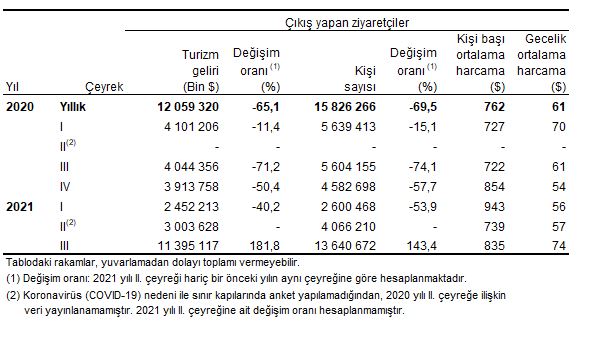 Ülkemizden çıkış yapan ziyaretçi sayısı 2021 yılı III. çeyreğinde bir önceki yılın aynı çeyreğine göre %143,4 artarak 13 milyon 640 bin 672 kişi oldu. Bunların %84'ünü 11 milyon 457 bin 951 kişi ile yabancılar, %16'sını ise 2 milyon 182 bin 721 kişi ile yurt dışında ikamet eden vatandaşlar oluşturdu.
