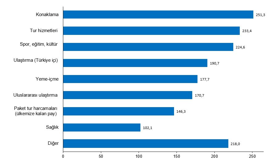 Bu çeyrekte tüm harcama türleri geçen yılın aynı çeyreğine göre arttı. Konaklama harcaması %251,3, tur hizmetleri harcaması %233,4 ve spor, eğitim, kültür harcaması %224,6 arttı.