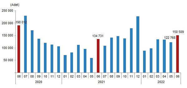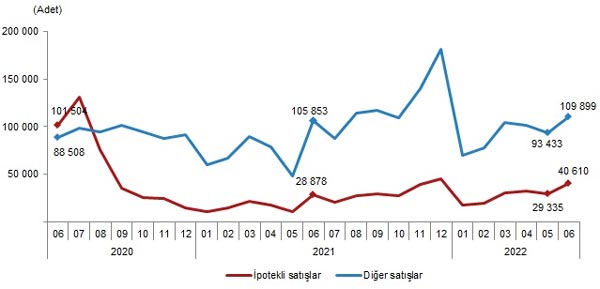 Türkiye genelinde ipotekli konut satışları Haziran ayında bir önceki yılın aynı ayına göre %40,6 artış göstererek 40 bin 610 oldu. Toplam konut satışları içinde ipotekli satışların payı %27,0 olarak gerçekleşti. Ocak-Haziran döneminde gerçekleşen ipotekli konut satışları ise bir önceki yılın aynı dönemine göre %63,5 artışla 170 bin 317 oldu.