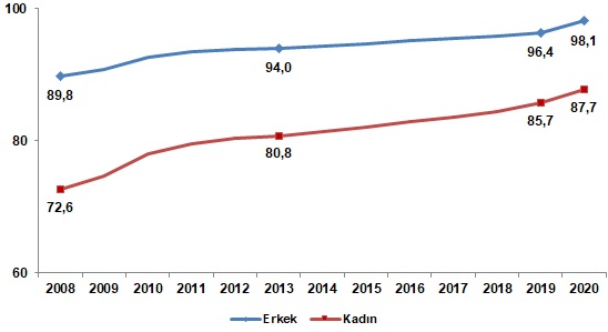 En az üniversite mezunu olan 25 ve daha yukarı yaştaki nüfusun toplam nüfus içindeki oranı ise 2008 yılında %9,8 iken 2020 yılında %22,1 oldu. Bu oran cinsiyete göre incelendiğinde; 2008 yılında 25 ve daha yukarı yaşta olup en az üniversite mezunu olan kadınların oranı %7,6, erkeklerin oranı %12,1 iken bu oran 2020 yılında kadınlarda %19,9, erkeklerde ise %24,4 oldu.