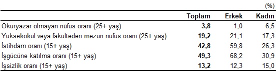 Hanehalkı işgücü araştırması sonuçlarına göre; 2020 yılında, Türkiye'de 15 ve daha yukarı yaştaki istihdam edilenlerin oranı %42,8 olup bu oran kadınlarda %26,3, erkeklerde ise %59,8 oldu.