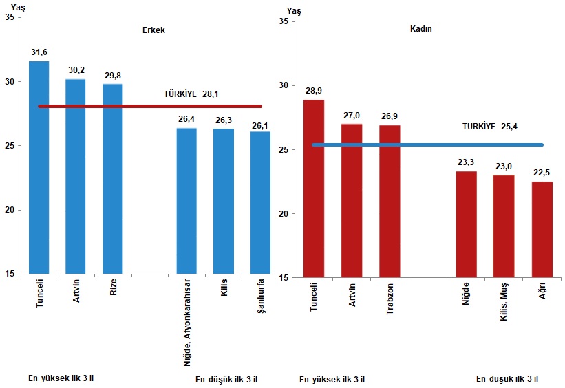 Evlenme istatistiklerine göre; resmi olarak ilk evliliğini 2021 yılında yapmış olan kadınların ortalama evlenme yaşı 25,4 iken erkeklerin ortalama evlenme yaşı 28,1 oldu. Ortalama ilk evlenme yaşının en yüksek olduğu il, kadınlarda 28,9 yaş, erkeklerde 31,6 yaş ile Tunceli oldu. Ortalama ilk evlenme yaşının en düşük olduğu iller ise kadınlarda 22,5 yaş ile Ağrı, erkeklerde 26,1 yaş ile Şanlıurfa oldu.