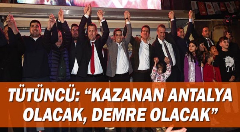 “Antalya’nın altın çağını 31 Mart’ta hep birlikte başlatıyoruz” diyerek sözlerini sürdüren Tütüncü, “Demre’nin altın çağını hep birlikte başlatıyoruz. Demre Antalya’nın en güzel ilçelerinden birisi... Tarih boyunca bu topraklar güneşin ülkesi olarak tanımlanmış. Akdeniz’in güneşi tarih boyunca bu topraklara hep bereket olmuş. Tarımla ilgilenen, turizmle ilgilenen hemşehrilerimiz, Demre’nin daha büyük bir potansiyelle yoluna devam etmesini, buraların daha çok şehirleşmesini, buraların daha da gelişmesini istiyor. Biz kadrolarımızla, ekiplerimizle bunu başaracağız. 15 yıllık belediyecilik deneyimimizle, ekiplerimizle, tecrübemizle Kepez’de nice belediyecilik hizmetlerimizle Antalya’da öncü olduk. Pek çok belediyecilik hizmetinde Türkiye’de takip edilen bir belediye olmayı başardık. Bir yandan yollar açarken, asfaltlar yaparken diğer taraftan yepyeni okullar yaparken, bir yandan da meslek edinme kursları, tarıma yönelik projeler, orman çiftlikleri kırsal kalkınmaya yönelik ve daha nice çalışmalar gerçekleştirdik. 700 bin nüfuslu Kepez’de çok önemli başarılara imza attık. Biz bunlarla hep iftihar ettik. Cumhur ittifakı bu başarılarımızla iftihar etti. Antalya bu başarılarımızla iftihar etti. Antalya’nın bütün ilçelerinde Kepez’in bu başarısı takip edildi. Biz bu başarıları nasıl elde ettik. Gecemizi gündüzümüze kattık. Akıp geçen zamana daha fazla eserler bırakmalıyız dedik. Allah bize yardım. Millet hep yanımızda durdu. Kazanan şehir oldu. Şimdi Türkiye’nin en büyük nüfuslu ilçelerinden biri olan Kepez’de bunları başaran ruh o birlik ve beraberlik ruhuydu. Sadece hemşehirilerinin duygusuyla hareket eden bir belediyecilik anlayışı, Antalya’nın 31 Mart itibari ile 19 ilçesine gelecek, yerleşecek. Ve kazanan Antalya olacak, Demre olacak.“ dedi.