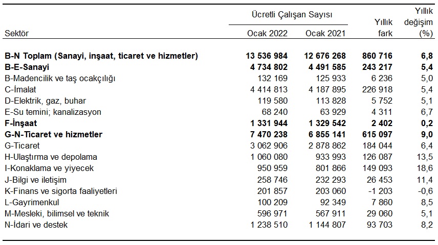 Ücretli çalışanların alt detaylarına bakıldığında; 2022 yılı Ocak ayında ücretli çalışan sayısı yıllık olarak sanayi sektöründe %5,4, inşaat sektöründe %0,2 ve ticaret-hizmet sektöründe %9,0 arttı.