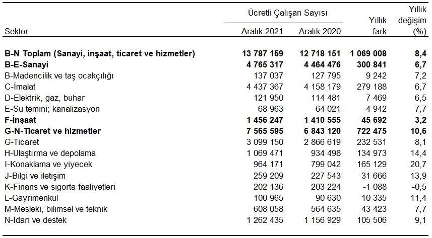 Ücretli çalışanların alt detaylarına bakıldığında; 2021 yılı Aralık ayında ücretli çalışan sayısı yıllık olarak sanayi sektöründe %6,7, inşaat sektöründe %3,2 ve ticaret-hizmet sektöründe %10,6 arttı.