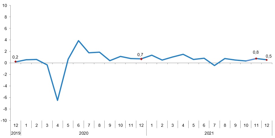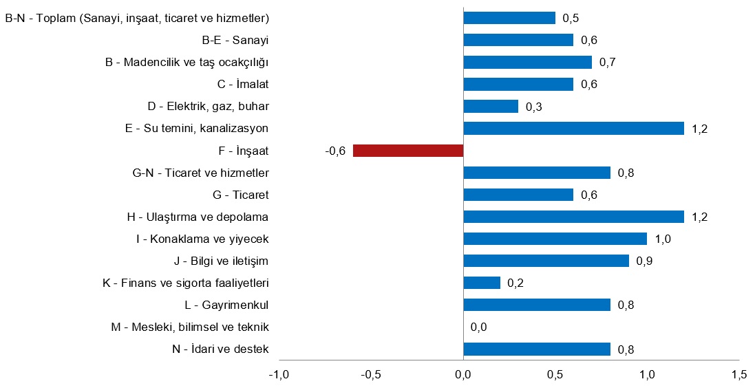 Sanayi, inşaat ve ticaret-hizmet sektörleri toplamında ücretli çalışan sayısı 2021 Aralık ayında bir önceki aya göre %0,5 arttı.
