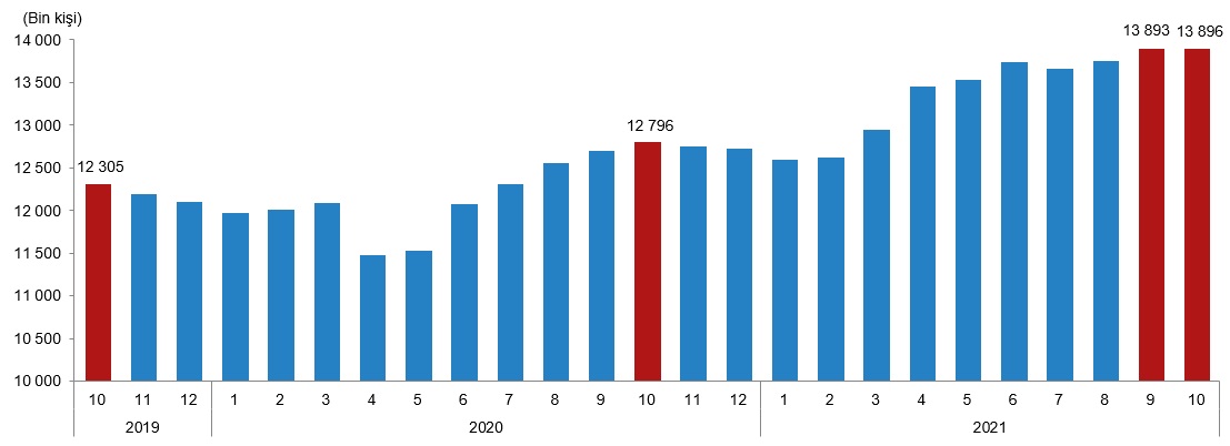 Ücretli çalışanların alt detaylarına bakıldığında; 2021 yılı Ekim ayında ücretli çalışan sayısı yıllık olarak sanayi sektöründe %7,2, inşaat sektöründe %8,2 ve ticaret-hizmet sektöründe %9,6 arttı.
