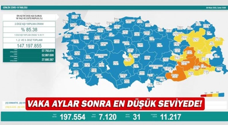 Sağlık Bakanlığı, 8 Nisan Corona virüs tablosunu paylaştı. Açıklanan tabloya göre son 24 saatte yapılan 197 bin 554 testte 7 bin 120 vaka tespit edildi. Koronavirüs nedeniyle 31 kişi hayatını kaybederken, 11 bin 217 kişinin de tedavisi ve karantinası sona erdi.