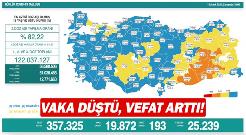 Sağlık Bakanlığı, 15 Aralık Corona virüs tablosunu ve aşılamada son durumu paylaştı. Türkiye'de son 24 saatte 357 bin 325 test yapılırken 19 bin 872 Vaka belirlendi. Koronavirüsten maalesef 193 vatandaşımız hayatını kaybederken hastalığa yakalanıp iyileşenleri sayısı 25 bin 239 oldu.
