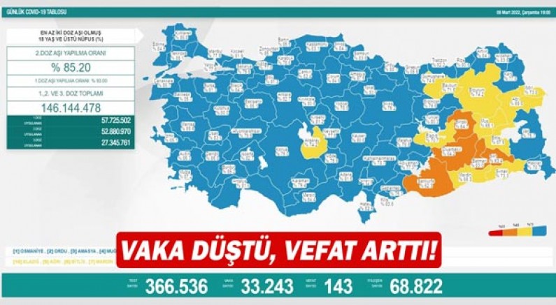 Sağlık Bakanlığı, 9 Mart Corona virüs tablosunu ve aşılamada son durumu paylaştı. Türkiye'de son 24 saatte 366 bin 536 test yapılırken 33 bin 243 Vaka belirlendi. Koronavirüsten maalesef 143 kişi hayatını kaybederken hastalığa yakalanığ iyileşenlerin sayısı 68 bin 822 olarak açıklandı.