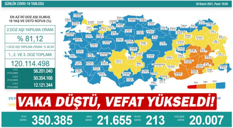 Sağlık Bakanlığı, 28 Kasım Corona virüs tablosunu paylaştı. Açıklanan tabloya göre son 24 saatte yapılan 350 bin 385 testte 21 bin 655 vaka tespit edildi. Koronavirüs nedeniyle 213 kişi hayatını kaybederken, 20 bin 7 kişinin de tedavisi ve karantinası sona erdi.