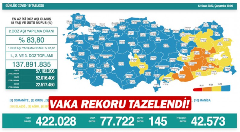 Sağlık Bakanlığı, 12 Ocak Corona virüs tablosunu ve aşılamada son durumu paylaştı. Türkiye'de son 24 saatte 422 bin 28 Kovid-19 testi yapıldı, 77 bin 722 kişinin testi pozitif çıktı, 145 kişi yaşamını yitirdi.