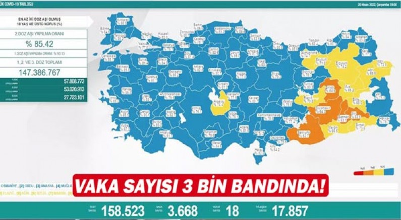 Sağlık Bakanlığı, 20 Nisan Corona virüs tablosunu paylaştı. Açıklanan tabloya göre son 24 saatte yapılan 158 bin 523 testte 3 bin 668 Vaka tespit edildi. Koronavirüs nedeniyle 18 kişi hayatını kaybederken, 17 bin 857 kişinin de tedavisi ve karantinası sona erdi.