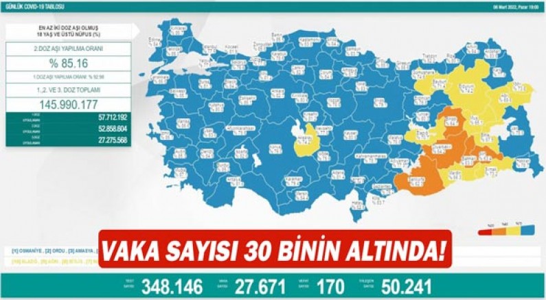 18 yaş ve üzeri nüfusun aşılanması verilerinde 1’inci doz Türkiye ortalaması yüzde 92,98, 2’nci doz ortalaması yüzde 85,16 olarak ölçüldü. Ayrıca, 1’inci dozda 57 milyon 712 bin 192, 2’nci dozda 52 milyon 858 bin 604 ve 3’üncü dozda 27 milyon 275 bin 568 olmak üzere toplam 145 milyon 990 bin 177 aşı uygulandı.