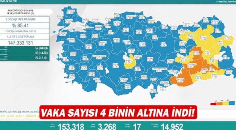 Sağlık Bakanlığı, 17 Nisan Corona virüs tablosunu paylaştı. Açıklanan tabloya göre son 24 saatte yapılan 153 bin 318 testte 3 bin 268 vaka tespit edildi. Koronavirüs nedeniyle 17 kişi hayatını kaybederken, 14 bin 952 kişinin de tedavisi ve karantinası sona erdi.