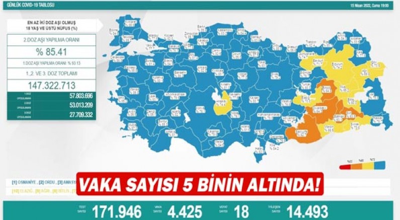 Sağlık Bakanlığı, 15 Nisan Corona virüs tablosunu paylaştı. Türkiye'de son 24 saatte 171 bin 946 test yapılırken, vaka sayısı 4 bin 425 olarak belirlendi. Koronavirüsten maalesef 18 kişi hayatını kaybederken hastalığa yakalanıp iyileşen sayısı 14 bin 493 oldu.