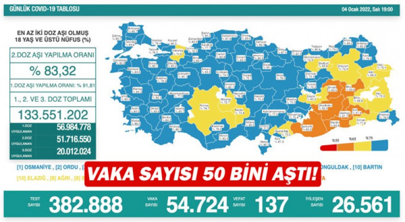 Sağlık Bakanlığı, 4 Ocak Corona virüs tablosunu ve aşılamada son durumu paylaştı. Türkiye'de son 24 saatte 382 bin 888 test yapılırken 54 bin 724 Vaka belirlendi. Koronavirüsten maalesef 137 vatandaşımız hayatını kaybederken, hastalığa yakalanıp iyileşen sayısı 26 bin 561 oldu.