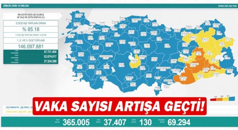 Sağlık Bakanlığı, 8 Mart Corona virüs tablosunu paylaştı. Açıklanan tabloya göre son 24 saatte yapılan 365 bin 5 testte 37 bin 407 vaka tespit edildi. Koronavirüs nedeniyle 130 kişi hayatını kaybederken, 69 bin 294 kişinin de tedavisi ve karantinası sona erdi.