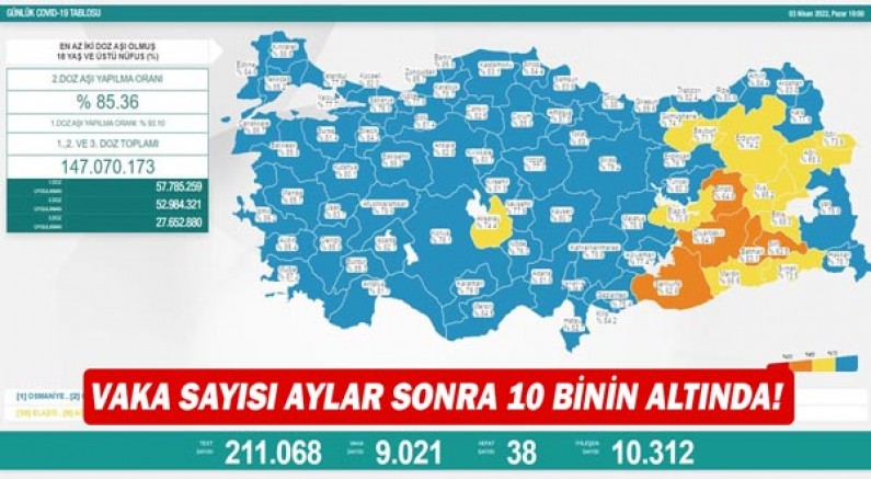 Sağlık Bakanlığı, 3 Nisan Corona virüs tablosunu paylaştı. Açıklanan tabloya göre son 24 saatte 211 bin 068 Kovid-19 testi yapıldı, 9 bin 021 kişinin testi pozitif çıktı, 38 kişi hayatını kaybetti.