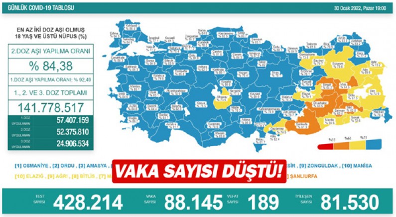Sağlık Bakanlığı, 30 Ocak Corona virüs tablosunu paylaştı. Açıklanan tabloya göre son 24 saatte yapılan 428 bin 214 testte 88 bin 145 vaka tespit edildi. Koronavirüs nedeniyle 189 kişi hayatını kaybederken, 81 bin 530 kişinin de tedavisi ve karantinası sona erdi.