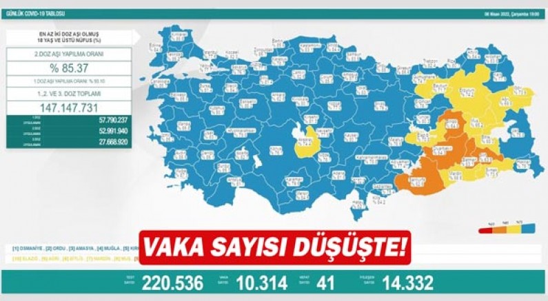 Sağlık Bakanlığı, 6 Nisan Corona virüs tablosunu paylaştı. Tabloya göre son 24 saatte 220 bin 536 test yapılırken 10 bin 314 Vaka belirlendi. Koronavirüsten 41 kişi hayatını kaybederken hastalığa yakalanıp iyileşen sayısı 14 bin 332 oldu.