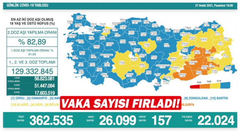 Sağlık Bakanlığı, 27 Aralık Corona virüs tablosunu paylaştı. Açıklanan tabloda, bir önceki güne göre vaka sayısında ciddi bir artış olduğu gözlemlenirken, son 24 saatte yapılan 362 bin 535 testte 26 bin 99 vaka tespit edildi. Koronavirüs nedeniyle 157 kişi hayatını kaybederken, 22 bin 24 kişinin de tedavisi ve karantinası sona erdi.