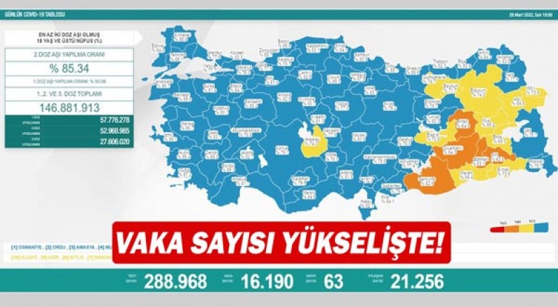Sağlık Bakanlığı, 29 Mart Corona virüs tablosunu paylaştı. Açıklanan tabloya göre son 24 saatte yapılan 288 bin 968 testte 16 bin 190 vaka tespit edildi. Koronavirüs nedeniyle 63 kişi hayatını kaybederken, 21 bin 256 kişinin de tedavisi ve karantinası sona erdi.