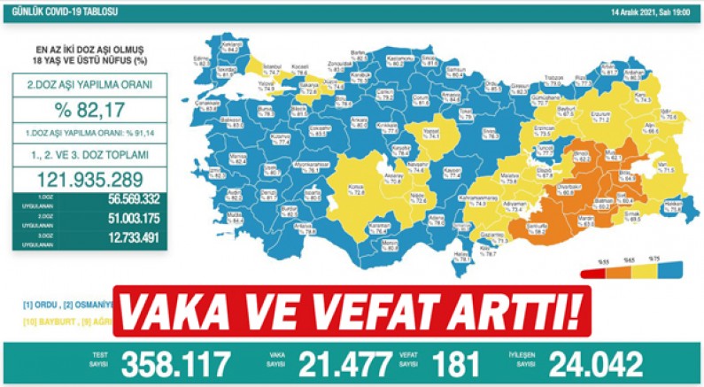 Sağlık Bakanlığı, 14 Aralık Corona virüs tablosunu paylaştı. Açıklanan tabloya göre son 24 saatte 358 bin 117 Kovid-19 testi yapıldı, 21 bin 477 kişinin testi pozitif çıktı, 181 kişi yaşamını yitirdi.