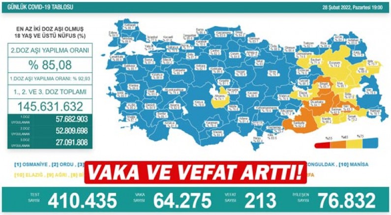 Sağlık Bakanlığı, 28 Şubat Corona virüs tablosunu ve aşılamada son durumu paylaştı. Açıklanan tabloya göre son 24 saatte yapılan 410 bin 435 testte 64 bin 275 vaka tespit edildi.