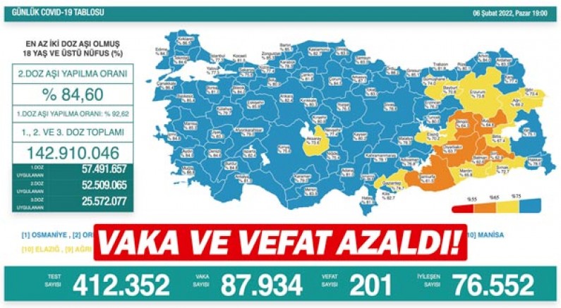 Sağlık Bakanlığı, 6 Şubat Corona virüs tablosunu paylaştı. Açıklanan tabloya göre son 24 saatte yapılan 412 bin 352 testte 87 bin 934 vaka tespit edildi. Koronavirüs nedeniyle 201 kişi hayatını kaybederken, 76 bin 552 kişinin de tedavisi ve karantinası sona erdi.