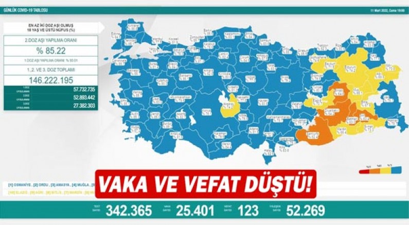 Sağlık Bakanlığı, 11 Mart Corona virüs tablosunu paylaştı. Açıklanan tabloya göre son 24 saatte yapılan 342 bin 365 testte 25 bin 401 vaka tespit edildi. Koronavirüs nedeniyle 123 kişi hayatını kaybederken, 52 bin 269 kişinin de tedavisi ve karantinası sona erdi.