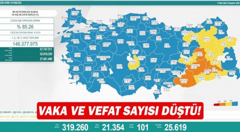 Sağlık Bakanlığı, 17 Mart Corona virüs tablosunu ve aşılamada son durumu paylaştı. Son 24 saatte 21 bin 354 yeni Vaka tespit edildi, 101 kişi hayatını kaybetti, 25 bin 619 kişi sağlığına kavuştu.