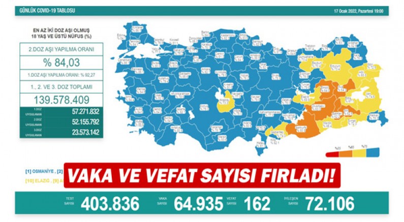 Sağlık Bakanlığı, 17 Ocak Corona virüs tablosunu paylaştı. Açıklanan tabloya göre son 24 saatte 403 bin 836 Kovid-19 testi yapıldı, 64 bin 935 kişinin testi pozitif çıktı, 162 kişi yaşamını yitirdi.