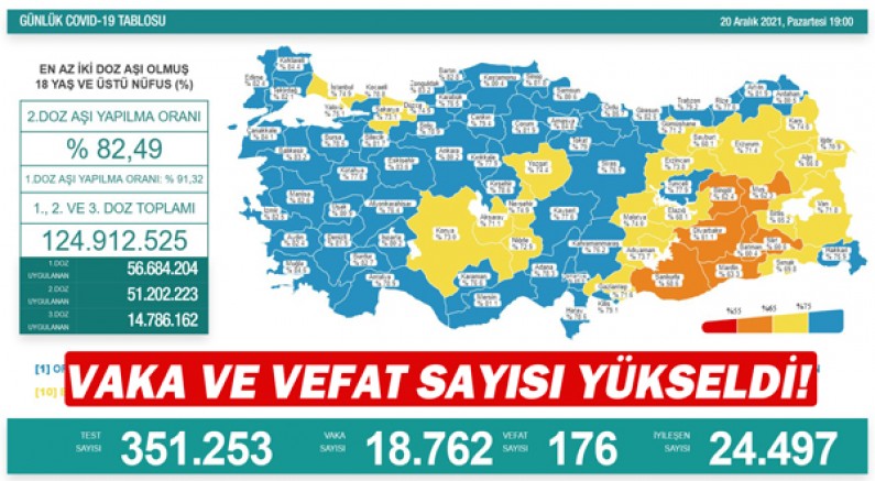 Sağlık Bakanlığı, 20 Aralık Corona virüs tablosunu paylaştı. Açıklanan tabloya göre son 24 saatte 351 bin 253 Kovid-19 testi yapıldı, 18 bin 762 kişinin testi pozitif çıktı, 176 kişi yaşamını yitirdi.