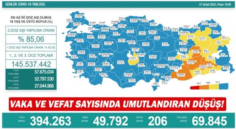Koronavirüs nedeniyle 206 kişi hayatını kaybederken, 69 bin 845 kişinin de tedavisi ve karantinası sona erdi. 18 yaş ve üzeri nüfusun aşılanması verilerinde 1’inci doz Türkiye ortalaması yüzde 92,92, 2’nci doz ortalaması yüzde 85,06 olarak ölçüldü. Ayrıca, 1’inci dozda 57 milyon 675 bin 34, 2’nci dozda 52 milyon 797 bin 530 ve 3’üncü dozda 27 milyon 44 bin 968 olmak üzere toplam 145 milyon 537 bin 442 aşı uygulandı.