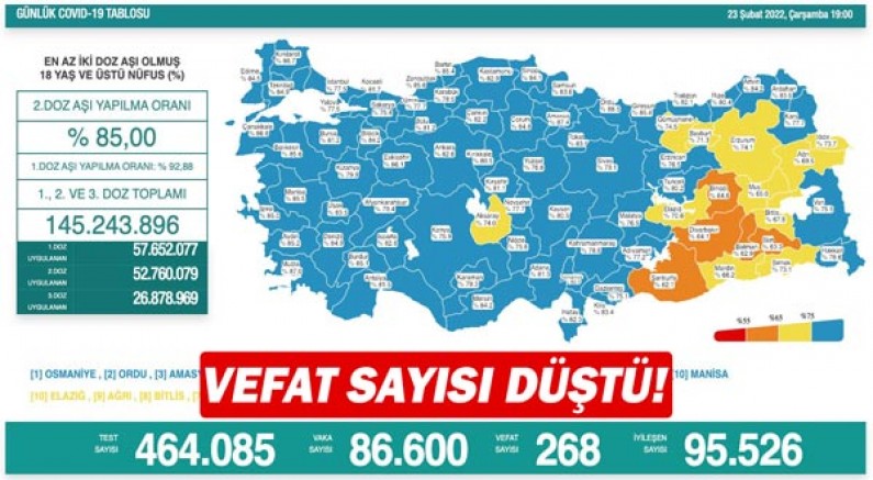 Sağlık Bakanlığı, 23 Şubat Corona virüs tablosunu ve aşılamada son durumu paylaştı. Türkiye'de son 24 saatte 464 bin 85 test yapılırken 86 bin 600 Vaka belirlendi. Koronavirüsten maalesef 268 vatandaşımız hayatını kaybetti. Öte yandan Covid-19'a yakalanıp iyileşen sayısı 95 bin 526 oldu.