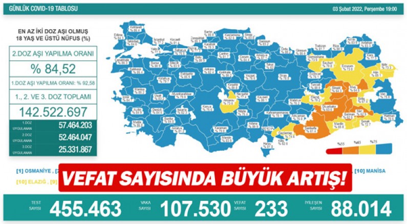 Sağlık Bakanlığı, 3 Şubat Corona virüs tablosunu ve aşılamada son durumu paylaştı. Türkiye'de son 24 saatte 455 bin 463 test yapılırken 107 bin 530 Vaka belirlendi. Koronavirüsten 233 kişi hayatını kaybederken hastalığa yakalanıp iyileşen sayısı 88 bin 14 oldu.